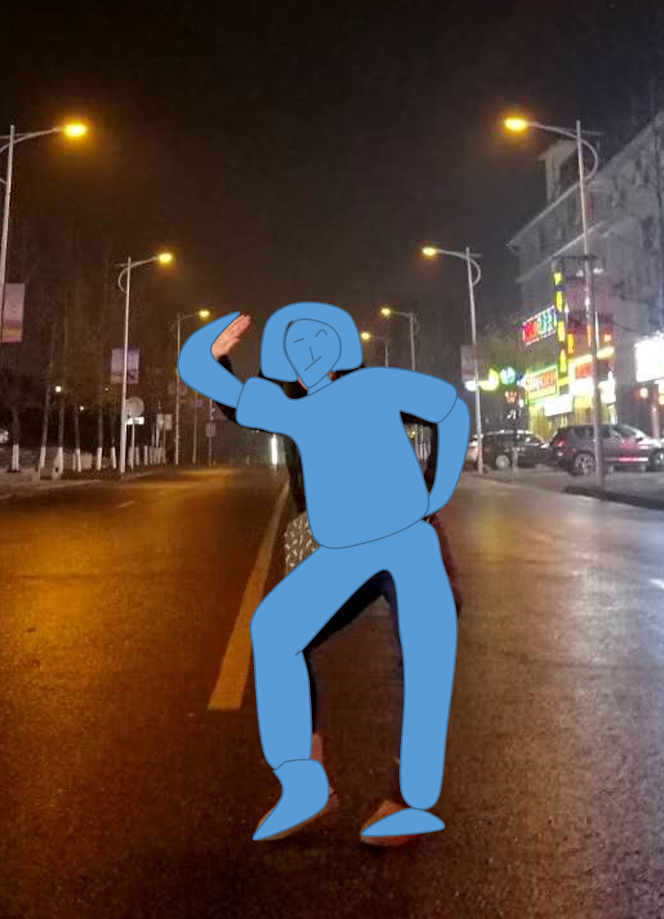 反正是自己弄,就选自己的照片吧,免得糟蹋别人,这是策划真实的想法。于是想到自己去旅游的一个系列照片,图片充满浓浓的欢呼雀跃的心情。对了,就找一张图做成现在流行的扁平风插画,展示夸张的人物造型以及趣味性的人物动态。(开玩笑,当时哪里想过这个意思,只有一个念头——做出点什么东西来。)三张照片单看照片都可以,但还是需要挑选肢体语言夸张一点的好做,考虑后,决定选用中间这一张。 恩,是策划本人没错了,在重庆旅游的时候凌晨在山顶路上拍的为了让造型的比例有节奏感,可以把脚、头部和腰部都缩小,裤子和肩膀、手臂放大。恩,去到第四个变形,跟原来的头像有了本质上的变形。。。。 。。